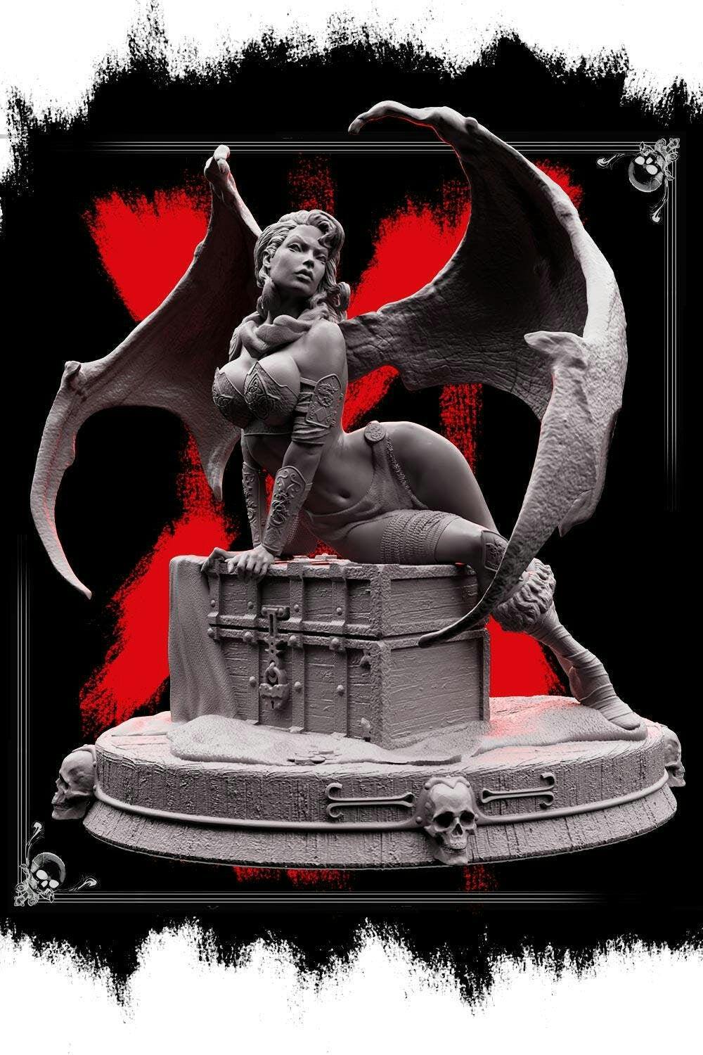 You are purchasing a single unpainted resin miniature of a Succubus Female Demon Guarding Treasure Chest NPC also NSFW (topless) D&D 5e / Pathfinder.
