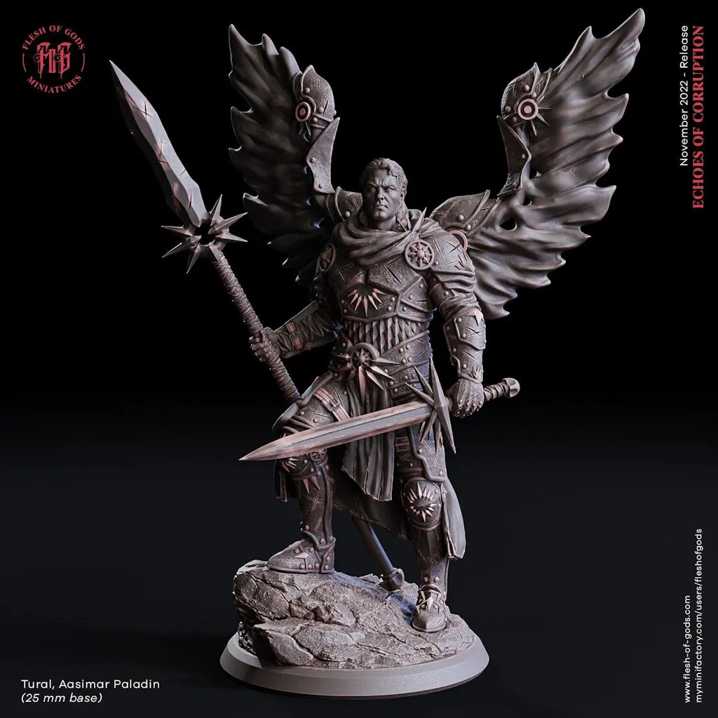 You are purchasing a single unpainted resin miniature of a AAsimar Paladin Cleric with Sword and Lance in Heavy Armor.