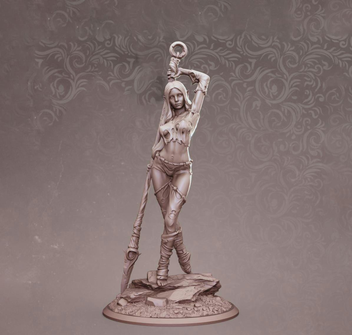 You are purchasing a single unpainted resin miniature of a Elf Pinup Female Fighter Polearm master Gladiator PC or NPC.
