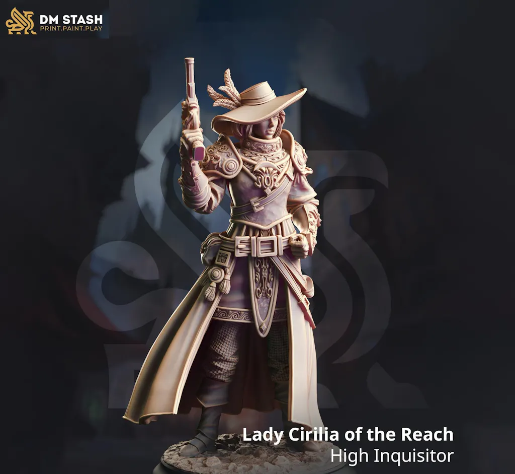 You are purchasing a single unpainted resin miniature of a Human Female Fighter, Gunslinger Witch Hunter, Inquisitor.