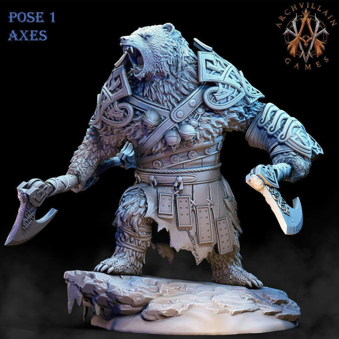 You are purchasing a single unpainted resin miniature of the Frostburn Bear Vanguard. This figure is available in 4 different poses, with Poses 1 & 2 coming with either Axes or swords.
