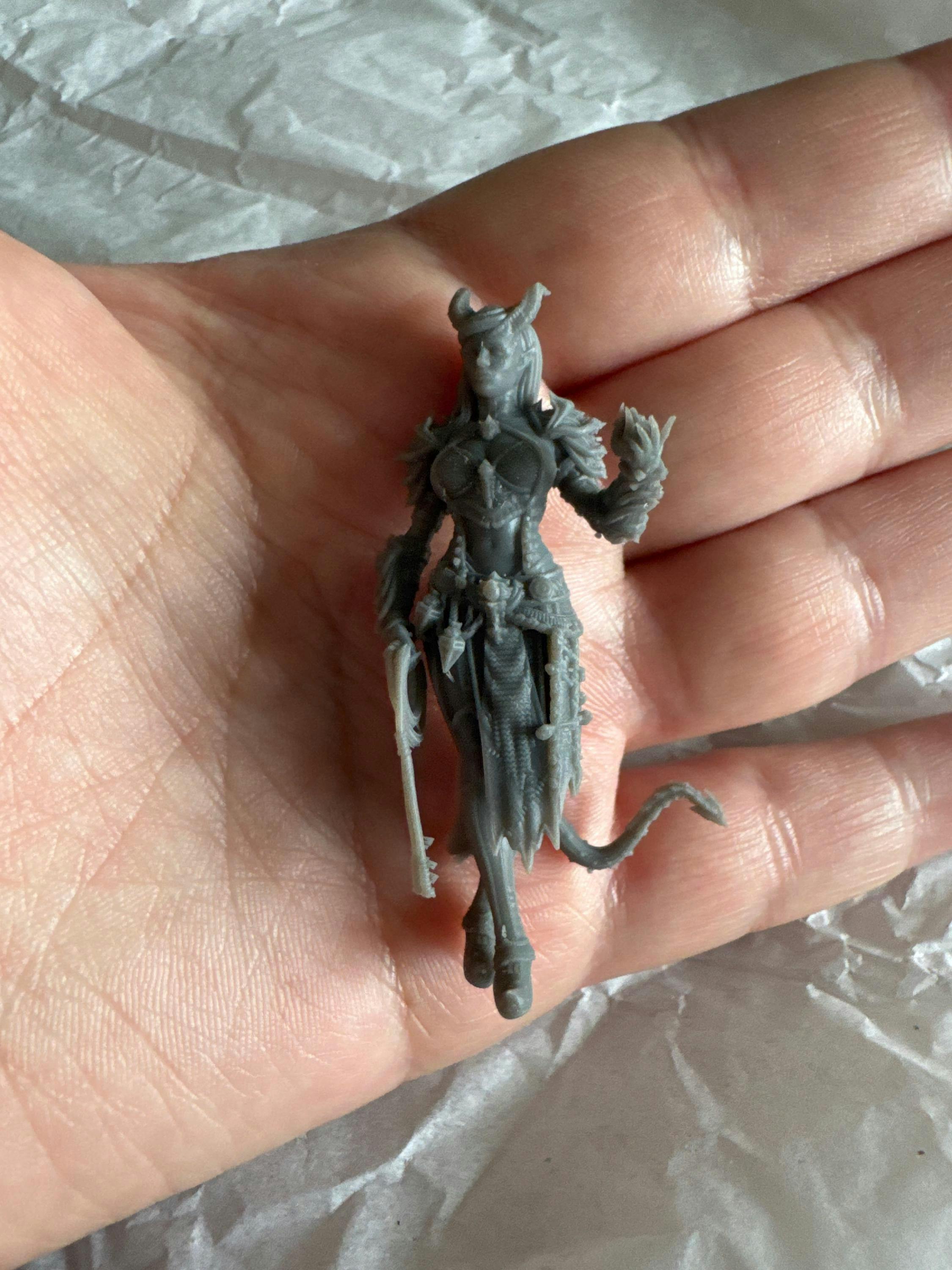 You are purchasing a single unpainted resin miniature of a Female Tiefling Sorcerer Warlock Arcane Trickster.