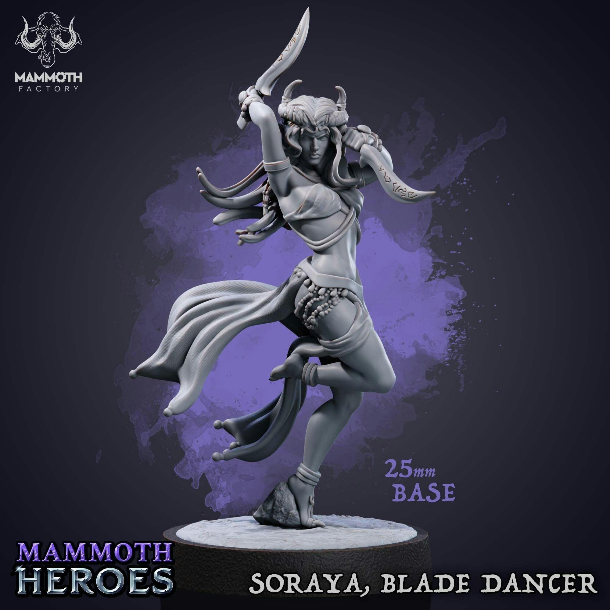 You are purchasing a single unpainted resin miniature of a Tiefling Female Fighter, Assassin, Monk Two Weapon Style. Soraya Blade Dancer.