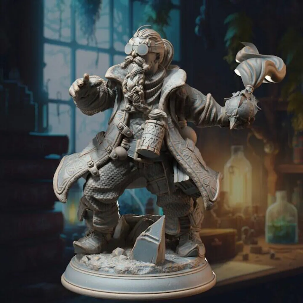 You are purchasing a single unpainted resin miniature of a Dwarf Alchemist Artificer.