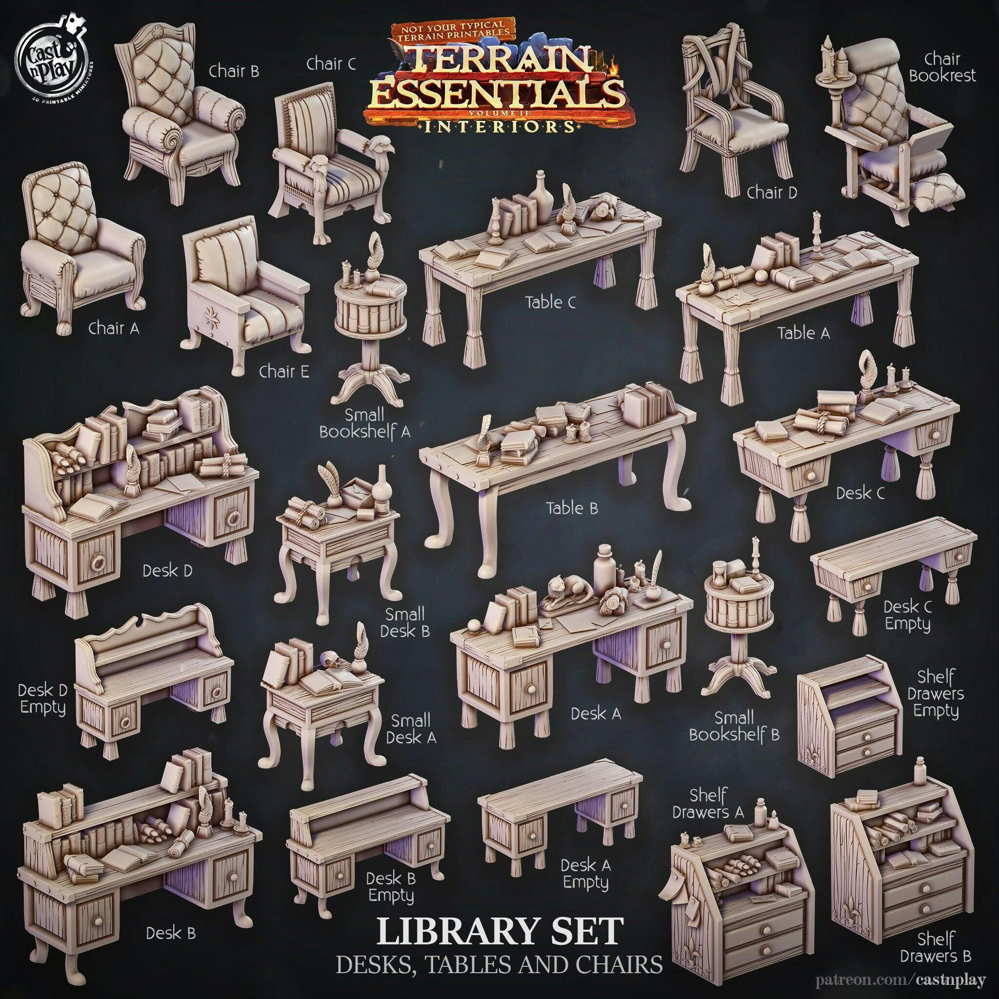 Library Set Desk, Tables and Chairs Scatter Props Terrain | Resin 28mm, 32mm| Dungeons &Dragons 5e Miniature | Pathfinder RPG Tabletop DnD